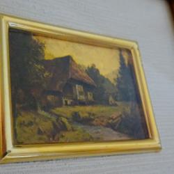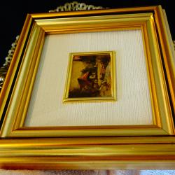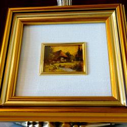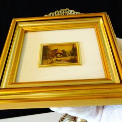 Стара немска картина с пейзаж, изображение на кокетна селска къща до гора и река, художествена литография върху златно фолио 960%. Има запазен етикет и сертификат на гърба. Рамката е изработена от плътно естествено дърво с дебела позлата. Колекционерска миниатюра, инвестиция в красота. Размер 12 х 11.5 х 2.5 см. Размер на картината 4.5 х 3.5 см.