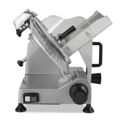 Професионалната колбасорезачка с диаметър на ножа 25 см е идеален уред за равномерно и прецизно нарязване на месо, сирена, хляб и други продукти. Позволява регулиране на дебелината на рязане от 1 до 12 мм, което я прави подходяща за различни приложения в професионални кухни, гастрономии и магазини. Оборудвана е с мощен, но тих двигател с 300 оборота в минута и удобна дръжка за безопасна работа. Изработена е от здрава алуминиева конструкция, а острието е от закалена неръждаема стомана, гарантиращо дълготрайност и перфектен разрез. Вграденият механизъм за заточване поддържа ножа винаги остър, а гумените крачета осигуряват стабилност върху работния плот. Технически параметри на продукта: Диаметър на острието: 25 см Размери на каретката: 18 х 23 см Максимална височина на рязане: 18 см Нето тегло: 14,3 кг Размери: 47 x 28 x 38 см Мощност: 0,15 kW 230V / 50Hz