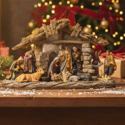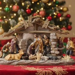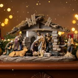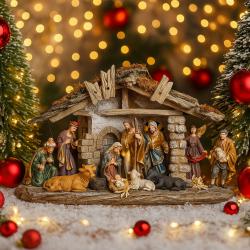 Тип продукт: Коледен комплект „Рождество Христово“ с ясли и фигурки; Състав: Тяло/фигурки от полирезин (смола) с ръчно оцветяване; навес с текстура на дърво и камък; декоративни елементи („слама“, каменни колони); Елементи в сцената: Светото семейство, влъхви, пастири, ангел с лента „Gloria“, овце/вол/магаре и други дребни детайли – общо над 10 части в композицията; Монтаж и поддръжка: Готова за използване; поставя се върху равна повърхност; почистване с мека суха кърпа; Приложение: Интериорна декорация – дом, офис, рецепция, витрина, училище/детска стая за разказване на коледната история; Размер: Среден, подходящ за рафт/комод/TV секция (компактен отпечатък; не изисква допълнителен монтаж); Опаковка: Твърда кутия – удобно съхранение след сезона; подходяща за подарък.