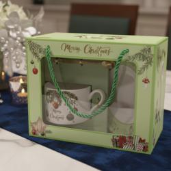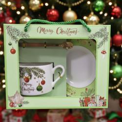 Технически характеристики Материали: Керамична чаша; лъжичка и лъжичка – метал; Размери: Чаша ~330 мл; компактна чинийка, удобна за сервиране; Цветове: Празнични зелени и червени мотиви; Безопасност: Подходящо за топли напитки; здрава керамика; Допълнителни елементи: Подаръчна кутия, въже за носене, прозрачна витрина; Подходящ за деца: Да – без остри елементи, стабилен дизайн; Подаръчна кутия: Дебел картон, декоративни акценти, готова за поднасяне.