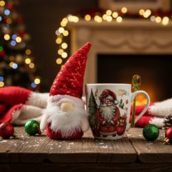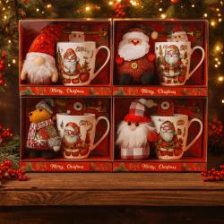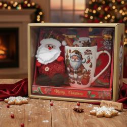 Материали: керамична чаша + лъжичка + текстилна мека фигурка; Размери: стандартна чаша ~300–350 мл; Цветове / детайли: празнични мотиви в червено, бяло, зелено и златисто; Безопасност: фигурките са меки; без остри елементи; Допълнителни елементи: готова декоративна подаръчна кутия; Подходящ за деца: да, фигурката е мека и приятна за игра; Опаковка / подаръчна кутия: прозрачен прозорец за лесно и ефектно подаряване; Варианти: с играчка гном, с играчка дядо коледа, с играчка джудже, с играчка еленче.