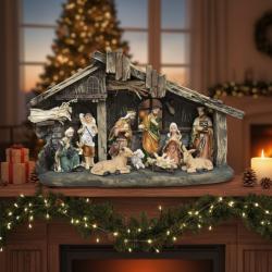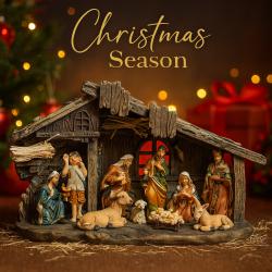 Продукт: Рождественска сцена (Коледни ясли с фигурки); Комплектът включва: стабилни ясли + фигурки на Мария, Йосиф, Младенеца, трима влъхви, пастир, агънце и две животни; Позициониране: настолно/под елха; подходящо за дом, офис, рецепция или витрина; Поддръжка: почистване със суха, мека кърпа; съхранение в кутията след сезона; Материал: твърд материал с фина детайлност и ръчно оцветяване; Целева употреба: празнична декорация; образователен разказ за Рождество за деца.