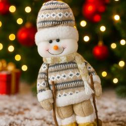 Тип продукт: Стояща коледна фигурка/декорация – Снежен човек; Материали (видимо от снимките): плюш за лицето, плетен текстил за дрехите (шапка, пуловер/шал), декоративни елементи със златист ефект за ботушите; Размери (прибл.): 35см; Предназначение: вътрешна употреба – домашен интериор, офис, витрина.
