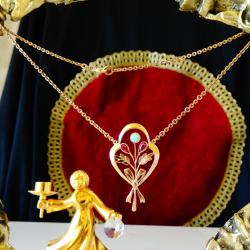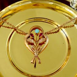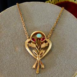 Старо дамско колие от 40 – те години на миналия век, ръчно изработено от високо качествена мед и 14 карата позлата. Много красив букет цветя в стил Art Nouveau с естествени скъпоценни камъни – етиопски огнен опал ръчно шлифован тип кабошон и два рубина. Има печат. Цветовете на опала са магически, но не излизат на снимките. Колието е с дължина 22 см. Висулка 4 х 2.2 см. Опал диаметър 4 мм. Тегло на колието 5 гр.