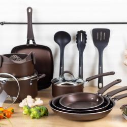 Материал: кован алуминий Покритие: мраморно незалепващо покритие, без PFOA, 3-слойно Съвместимост: подходящ за всички видове печки, включително индукция Дръжки: меки на допир силиконови, термоизолирани Капаци: закалено стъкло с отвор за пара Устойчивост: на надраскване и високи температури Размери на съдовете в комплекта: Тенджера 16 x 8 см с капак — 1,6 л Тенджера 20 x 9 см с капак — 2,8 л Тенджера 24 x 12 см с капак — 5,4 л Тиган 20 x 4 см Тиган 26 x 4,8 см Тиган 30 x 5 см Квадратен тиган 24 x 24 x 4,3 см Тава за мъфини 15,35 x 11,02 x 1,57 см Форма за кекс 9,09 x 5,04 x 2,72 см Кръгла тава 8,54 x 1,97 см Тава 13,38 x 9,64 x 2,16 см Тава 13,38 x 9,64 x 1,38 см Цедка