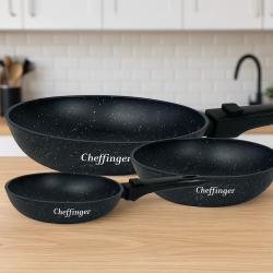 Предимства: • Дизайн, пестящ място – Свалящите се дръжки правят съхранението изключително лесно; • Многофункционална употреба – За готвене, печене и фурна (без дръжка); • Оптимално рапределение на топлината – Лятият алуминий осигурява равномерно готвене; • Подходящо за съдомиялна машина – За бързо и лесно почистване; • Стилно черно покритие – вечен дизайн, който се вписва във всяка кухня; Спецификации: Цвят: Черен; Материал: Алуминий, Стъкло; Покритие: Мрамор; Съдържание: 1 тиган ø 20 см.; 1 тиган ø 24 см.; 1 тиган ø 28 см.