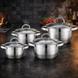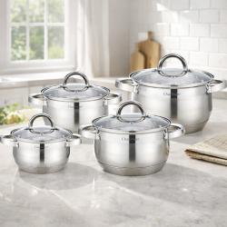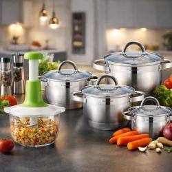 Комплект тенджери CF-SS8: Материал: неръждаема стомана (инокс); Комплектът включва: 2,1 L – Ø16 × 10,5 см; 2,9 L – Ø18 × 11,5 см; 3,9 L – Ø20 × 12,5 см; 5,1 L – Ø22 × 13,5 см; Капаци: стъклени, с отвор за пара; Дъно: подходящо за индукционни, газови и електрически котлони; Поддръжка / почистване: лесно ръчно или машинно измиване; Безопасност: подходящи за контакт с храна; Ръчен чопър CF-CHOP02: Материал на остриетата: неръждаема стомана; Размери: 13,5 × 13,5 × 30 см; Капацитет: 900 мл; Тегло: 0,43 кг; Начин на работа: ръчен механизъм с натиск; Поддръжка / почистване: лесно ръчно измиване; Безопасност: подходящ за контакт с храна.