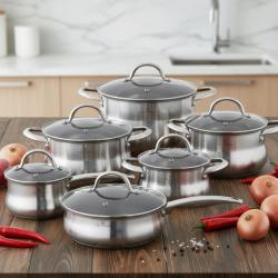 Материал: висококачествена неръждаема стомана Покритие на тигана: тефлоново незалепващо Дъно: многослойно за оптимална топлопроводимост Капаци: закалено стъкло с отвор за пара Съвместимост: газ, електрически, керамични и индукционни котлони Почистване: лесно, препоръчва се нежно измиване; подходящо и за съдомиялна при нискотемпературни програми и некорозивни препарати Тенджера с капак 16 см x 9 см, вместимост 1.8 л (две еднакви) Тенджера с капак 18 см x 10 см, вместимост 2.5 л Тенджера с капак 20 см x 11 см, вместимост 3.4 л Тенджера с капак 24 см x 12 см, вместимост 5.5 л Дълбок тефлонов тиган с капак 24 см x 7 см, вместимост 3.1 л