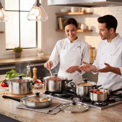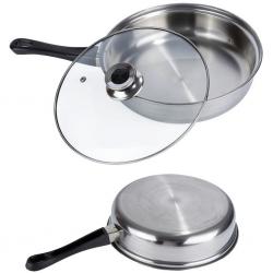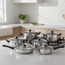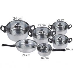 Материал: неръждаема стомана (инокс) — безопасна за храна и устойчива на корозия. Съвместимост: подходящ за повечето видове печки, включително газови плотове (без индукция). Покритие и капаци: термоустойчиво стъкло с отвор за пара; метални/пластмасови дръжки. Почистване: подходящи за съдомиялна машина, лесни за поддръжка. Комплектът включва: 5 тенджери (диаметри: 24, 21.8, 20, 18, 16 см), 1 тиган 24 см и 6 стъклени капака.