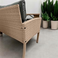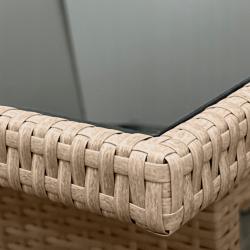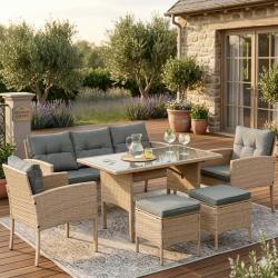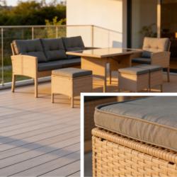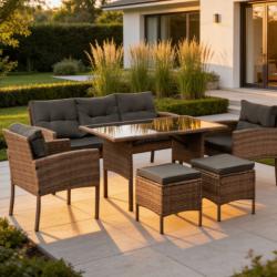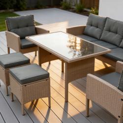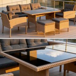 Технически характеристики на Комплект градински мебели от техноратан - перфектен кът за релакс Техническите размери и характеристики са прецизно изработени за комфорт и стабилност: 3-местен диван: обща ширина 160 см, височина 77 см, дълбочина 58 см, височина на седалката ~46 см. Фотьойли (2 бр.): ширина 57 см, дълбочина 50 см, височина 76 см, височина на подлакътниците 62 см. Маса за хранене: дължина 120 см, ширина 70 см, височина 70 см; плот от закалено стъкло. Пуфове (2 бр.): 40 х 40 см, височина с възглавница 46 см, рамка 40 см. Материали: прахово боядисана стомана, висококачествен синтетичен ратан, полиестерни калъфи с ципове. Препоръчително пространство: около 2,5 х 2 метра за класическо разположение.