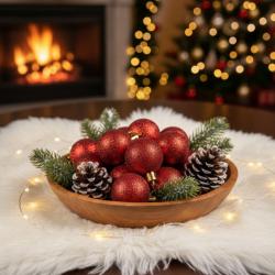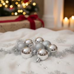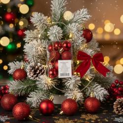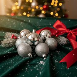 Продукт: комплект мини коледни топки; Варианти и брой: Сребро – 8 бр.; Червено – 16 бр; Размер: Ø 2 см (и за двата комплекта); Материал: пластмаса (нечуплива); Повърхности: гланц, мат, брокат (смесено в опаковката); Монтаж: с включени връвчици/връзки за окачване; Приложение: елхи, венци, гирлянди, адвент декорации, маси, офис ъгъл, витрини; Поддръжка: почиствай с мека суха кърпа; не използвай абразиви.