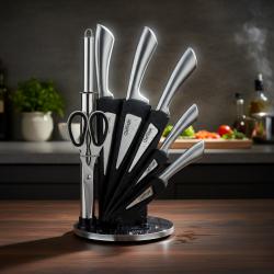 Тип продукт: Комплект ножове 8 части - 5 ножа, ножица, точило и стойка; Материал: неръждаема стомана (ножове), акрил (стойка); Размери: Точилка (масат): 19.10 см; Ножица: 18.40 см; Нож за белене: 8.90 см; Универсален нож: 12.70 см; Нож за хляб: 20.30 см; Готварски нож: 20.30 см; Сатър: 16.50 см; Температурна устойчивост: подходящи за стандартна кухненска среда; Поддръжка / почистване: ръчно измиване, лесно почистване; Допълнителни функции: 360° въртяща се основа.