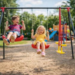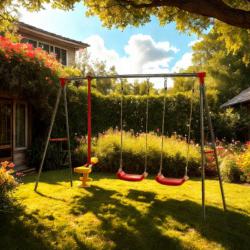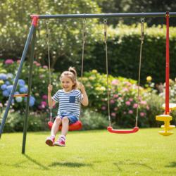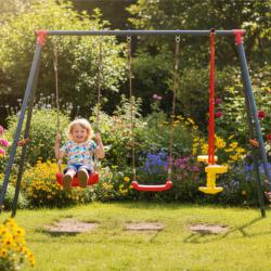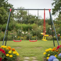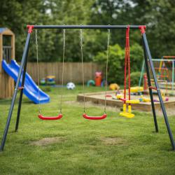Технически характеристики на Комплект от 2 люлки и балансираща везна - рецепта за часове забавление Техническите данни гарантират сигурност и дълготрайност: Размери: 290 × 180 × 200 см Рамка: прахово боядисан метал Диаметри на тръбите: 50 мм (2 мм), 45 мм (1 мм), 25 мм (1 мм) Цветове на седалките: 2 червени, балансираща греда жълто-червена Максимална товароносимост: 50 кг на потребител Подходящо за градини, детски кътчета и открити игрища