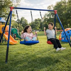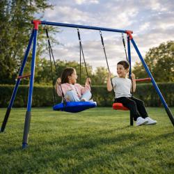 Технически характеристики на Комплект от 2 метални люлки FunZone - безкрайно забавление на двора Размери на основата: 109,4” Ш x 54” Д x 68,9” В Диаметър на люлка тип чинийка: 23,6” Материал: прахово боядисана стомана (2-инчови тръби), формована пластмаса и здрави въжета Капацитет: общо до 200 lb (около 90 кг), по 100 lb на елемент Препоръчителна възраст: 3+ години Включва: 4 заземителни колчета, подплънки от пяна за краката, регулируеми закрепвания Стандарти: отговаря или надвишава изискванията за безопасност ASTM за жилищни детски площадки