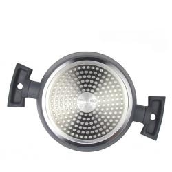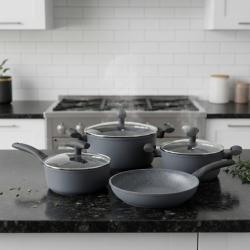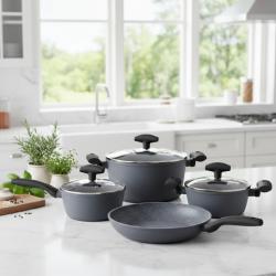 Материал: Кован алуминий; Размери: Касерола: 16 см; Малка тенджера: 20 см; Голяма тенджера: 24 см; Тиган: 24 см; Капак: Стъклен с отвор за пара; Дръжки: Със заоблени ръбове; Покритие: Незалепващо, за лесно готвене с минимално количество мазнина; Поддръжка: Лесно почистване, подходящи за съдомиялна машина; Цвят: Сив; Допълнителни функции: Турбо индукция, енергоспестяващо готвене.