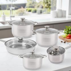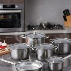 Материал: неръждаема стомана 18/10 Брой части: 12 Включва: Тенджера Ø16 × 10.5 см – 2.1 L Тенджера Ø18 × 11.5 см – 2.9 L Тенджера Ø20 × 12.5 см – 3.9 L Тенджера Ø24 × 14.5 см – 6.6 L Касерола Ø16 × 10.5 см – 2.1 L Тиган Ø24 × 7.5 см – 3.4 L Общо: 6 съда + 6 стъклени капака (12 части) Тип дъно: капсуловано, многослойно Съвместимост: газ, електрически, стъклокерамични и индукционни котлони Почистване: подходящ за съдомиялна