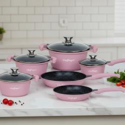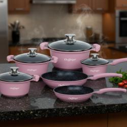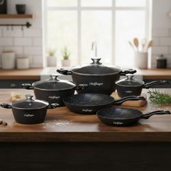 Материал: лят алуминий с незалепващо мраморно покритие, стъкло, неръждаема стомана; Комплектът включва: тенджери: Ø16 см, Ø20 см, Ø24 см, Ø28 см; тигани: Ø24 см, Ø28 см; 4 стъклени капака; Размери (Вר): 16×7.5 см, 20×9.5 см, 24×12 см, 28×12.5 см; тигани: 24×5.0 см, 28×5.5 см; Подходящи за всички източници на топлина; Безопасност: 100% PFOA free, без олово и кадмий; Общо тегло: 6,9 кг.