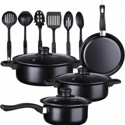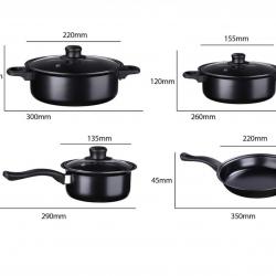 Опции за съвместимост: Газови, електрически, индукционни; Материал: Желязна сплав; Цвят: Черен; Комплектът е изработен от висококачествена желязна сплав, с незалепващо покритие отвътре, капак от закалено стъкло и топлоизолирани дръжки отвън, черен външен вид, класически и лесен за използване; Комплектът включва 2 тенджери, 1 касерола, 1 тиган, 3 стъклени капака + комплект от 6 части за готвене; Дъното на съда се нагрява равномерно. Подходящи за използване на газови, електрически и индукционни котлони; Не променя вкуса или характеристиките на храната и има незалепващо покритие. Размери: Диаметър голяма тенджера 220 мм., височина 120 мм.; Диаметър средна тенджера 155 мм., височина 120 мм.; Диаметър касерола 135 мм., височина 120 мм.; Диаметър тиган 220 мм., височина 45 мм.