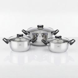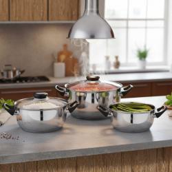 Практичен комплект тенджери MC1855 от 6 части - идеален избор за всяко домакинство, което цени качеството, издръжливостта и модерния дизайн в кухнята. Характеристики: Модел / Код: MC1855; Комплект: 6 части (3 съда + 3 капака); Размери и обем: 16 × 9,5 см - 1,6 л; 18 × 10,5 см - 2,2 л; 20 × 11,5 см - 3,1 л; Съвместимост с плотове: Не е съвместим с индукция (NO INDUCTION). Комплектът включва 6 части - различни по обем тенджери с капаци. Изработени от висококачествена неръждаема стомана, устойчива на надрасквания и висока температура. Термоустойчива стъклена капачка с отвор за пара за безопасно и контролирано готвене. Ергономични дръжки, които не се нагряват и осигуряват комфорт при употреба. Лесни за почистване - могат да се мият в съдомиялна машина. Доставка с Еконт с преглед.