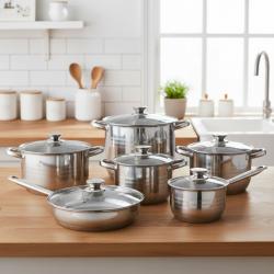 Продукт: Комплект тенджери – 12 части Основен проблем, който решава: неравномерно готвене, загаряне, бърза загуба на топлина Решение: 5-слойно дъно + неръждаема стомана за равномерно, контролирано и енергийно ефективно готвене Материал: корозионно устойчива неръждаема стомана Дъно: 5-слойно термодъно Съвместимост с котлони: индукция, газ, електрически, керамични Размери и вместимост: Тенджера с капак Ø 16 × 10.5 см – 2.1 L Тенджера с капак Ø 18 × 11.5 см – 2.9 L Тенджера с капак Ø 20 × 12.5 см – 3.9 L Тенджера с капак Ø 24 × 14.5 см – 6.6 L Касерола с капак Ø 16 × 10.5 см – 2.1 L Тиган с капак Ø 24 × 7.5 см – 3.4 L Почистване: подходящи за миялна машина Безопасност: термоизолирани дръжки; капаци от закалено стъкло Сертификация: CE