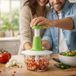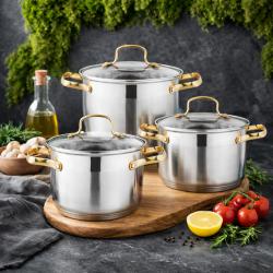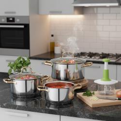 Комплект от 3 тенджери с капак: Материал: Неръждаема стомана; Капаци: Стъклени с параван за безопасност; Дръжки: Златисти, анодизирани; Подходящи за всички видове котлони, включително индукционни; Размери и диаметър на тенджерите: 16 × 10 см - 2.0 литра; 18 × 11 см - 2.8 литра; 20 × 12 см - 3.8 литра. Ръчен чопър: Материал: Пластмаса, неръждаема стомана; Механизъм: Ръчен; Остриета: 3; Вместимост: 900мл.