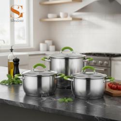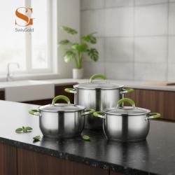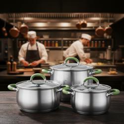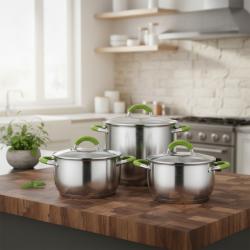 Технически характеристики на Комплект тенджери Swisgold Alana – 3 броя с капак от неръждаема стомана с 5-слойно капсулно дъно Стабилни и практични технически предимства, подходящи за всяко домакинство Дъно: петслойно капсулно дъно за бързо и равномерно разпределение на топлината Материал: висококачествена неръждаема стомана, съвместима с различни видове котлони Капаци: стъклени, с метален ръб за по-добро уплътнение и лесен контрол по време на готвене Дръжки: ергономични, с топлоизолационно покритие в зелен цвят Размери и вместимост: 18 см – 2,3 л 20 см – 3,1 л 24 см – 5,3 л Подходящи за ежедневно готвене, с отлично задържане на топлината Лесни за почистване