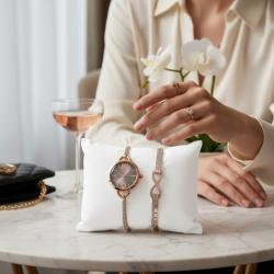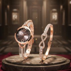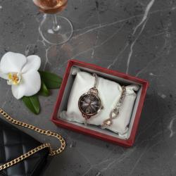 Тип: дамски часовник с аналогов дисплей + бижутерска гривна в комплект; Механизъм: кварцов (батерия); Корпус и гривни: метална сплав с покритие в цвят розово злато; инкрустации с декоративни камъни; Циферблат: опушено-кафяв/графитен, слънчев ефект; индекси с кристали при 12 и 6, маркери по останалите позиции; Каишка/верижка на часовника: тип бижутерска гривна, удобно закопчаване; Размер: компактен дамски размер; Водоустойчивост: подходящ за ежедневна употреба; не е предназначен за къпане, плуване или продължителен контакт с вода; Поддръжка: избягвай контакт с парфюми/козметика върху металните части; почиствай с мека суха кърпа; Подходящ за: ежедневие, официални поводи, подарък.