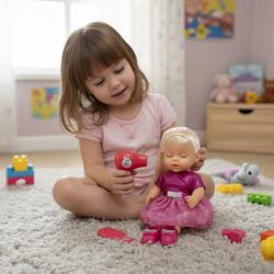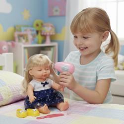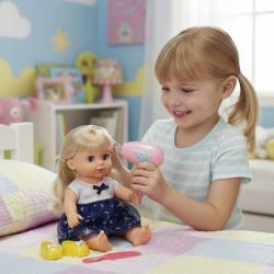 Материали: Пластмаса и гума; Размери: Височина на куклата: 28 см; Цветове: Розова и синя рокля; Варианти: кукла с розова рокля; кукла със синя рокля; Безопасност / стандарт: Безопасна за деца над 3 години, сертифицирана по европейски стандарти; Допълнителни елементи: Музикален чип с 10 звука, аксесоари за грижа (сешоар, гребен, бутилка, хигиенни продукти); Подходящ за деца: За деца над 3 години; Батерии: включени в комплекта; Опаковка: Подаръчна кутия с размери 24 см × 11 см × 33 см.