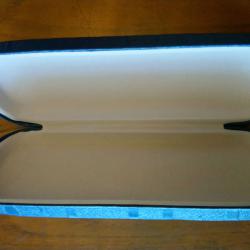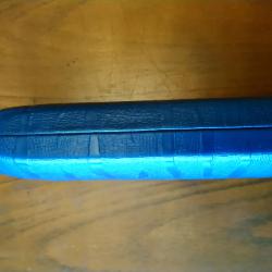 Кутия за очила синя. Произход Китай около 2010 г. Габаритни размери на кутията 160*60*36 мм..Вътрешни размери на кутията 146*46*22 мм..Материал различни видове полимери. Кутията не е използвана.
