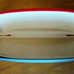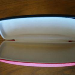 Кутия за очила червено - черна. Произход Китай около 2010 г. Габаритни размери 165*54*36 мм..Вътрешни размери 150*40*22 мм..Материал различни видове полимери. Кутията не е използвана.
