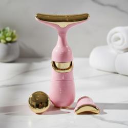 3-в-1 масажорът е решение за уморена, отпусната кожа, подпухнали очи и фини бръчки. Той комбинира високочестотна вибрация и микроток, за да активира колагена, да стегне контура и да подобри усвояването на серуми. Подходящ е за лице, шия и околоочна зона, като намалява подпухналостта и връща свежия вид още след първите процедури. Уредът разполага с 3 сменяеми масажни глави, ергономичен „dolphin tail“ дизайн и метални масажни повърхности. Компактен, лек и удобен за ежедневна грижа. Работи с 1×AA батерия. Предлага ефект „SPA у дома“ – стягане, изглаждане и дълбока хидратация за всички типове кожа.