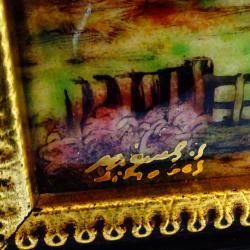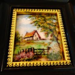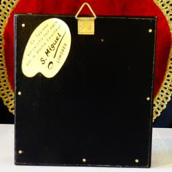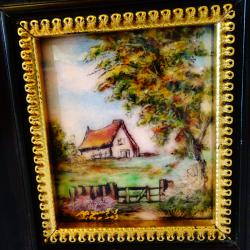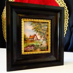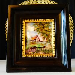 Стара картина, есенен пейзаж с кокетна къща, емайлирана миниатюра Лимож, подписана от художника S. Miguel. Картината е ръчно рисувана с емайли върху меден лист. Има позлатена рамка от естествено дърво. Размер 13 х 12 х 3 см. Размер на картината 8 х 7 см.