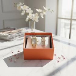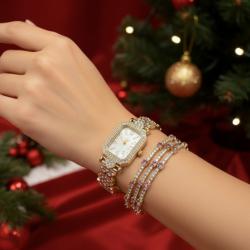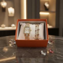 Материали: метален златист корпус, декоративни кристали, метални елементи и нежни камъчета в розов и прозрачен цвят; Елементи в комплекта: 1 часовник + 3 гривни; Размери: регулируеми гривни; компактен корпус на часовника; Цветове: златисто, розово, прозрачен кристал; Безопасност: хипоалергенни материали; Опаковка: луксозна подаръчна кутия – удобна и за съхранение.