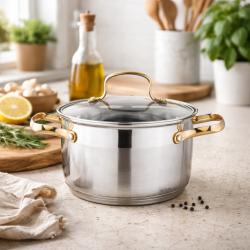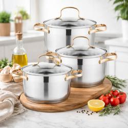 Материал: Неръждаема стомана Капаци: Стъклени с параван за безопасност Дръжки: Златисти, анодизирани Подходящи за всички видове котлони, включително индукционни Размери и диаметър на тенджерите: Тенджера 1 (2.5 литра): диаметър 20 см Тенджера 2 (4.0 литра): диаметър 22 см Тенджера 3 (6.0 литра): диаметър 24 см