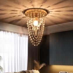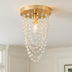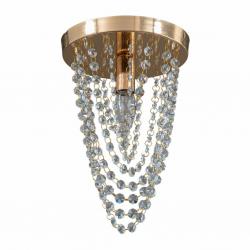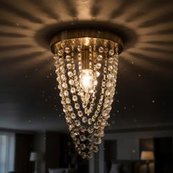 Тип: таванен плафон (прилепнал монтаж); Конструкция: метална основа с златисто/месингово покритие; Висящи елементи: прозрачни фасетирани вериги тип „кристал“; Източник на светлина: 1 × крушка тип „свещ“ - E14; Размери: Ø 20 см (диаметър), височина 30 см; Препоръчителна употреба: интериорни сухи помещения (антре, коридор, спалня, дневна зона); Монтаж: към плосък таван; изисква стандартно електрическо свързване от квалифициран техник; Гаранция: 12 месеца.
