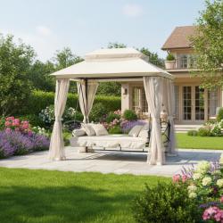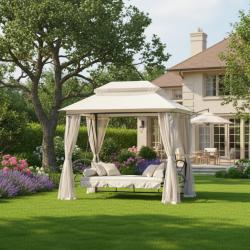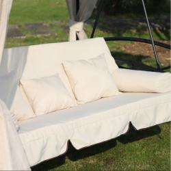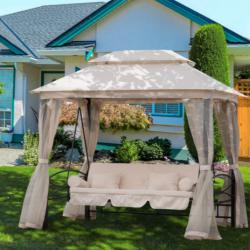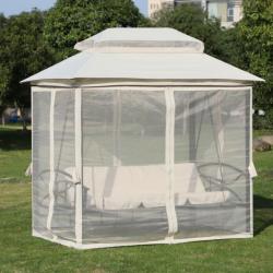Размери в позиция за сядане: Дължина 180 см x Ширина 50 см x Височина 49 см. Размери в легнала позиция: Дължина 180 см x Височина 104 см. Външни размери на шатрата: Дължина 245 см x Ширина 165 см x Височина 243 см; височина на прохода 185 см. Материали: Стоманена рамка, водоустойчив полиестерен покрив, дишаща мрежа против насекоми, меки подплатени възглавници. Капацитет: До 3 души комфортно; мек пълнеж на възглавниците (5 см). Монтаж: Лесен и бърз монтаж с включени крепежни елементи.