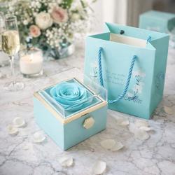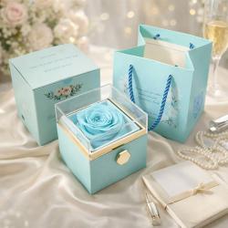 Цвят: Нежно пастелно синьо със златни акценти; Механизъм на чекмеджето: Въртящо се чекмедже със златиста дръжка; Предназначение: Подходяща за малки бижута (пръстен, колие, обеци), любовни бележки или сувенири; Размер на кутията: 9,5 x 8,3 x 9 см; Забележка: Бижутата не са включени в комплекта.