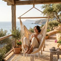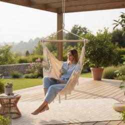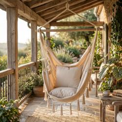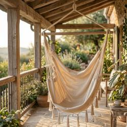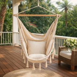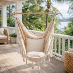 Технически характеристики на Люлка - хамак в Бразилски Бохо стил - стилен и модерен дизайн Техническите данни гарантират качество и безопасност, ясно представени за вашата увереност: Размери на седалката: 130 x 100 см Цвят: бежов Напречна греда: 3.3 x 90 см, масивно дърво Материал: полиестер/памучен плат Стил: БОХО Максимална товароносимост: 150 кг Подходящ за употреба в дом, градина, на балкон и във вътрешни зони за почивка