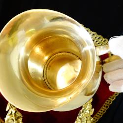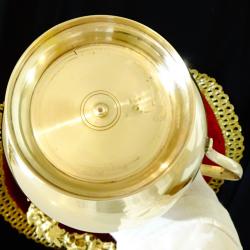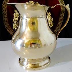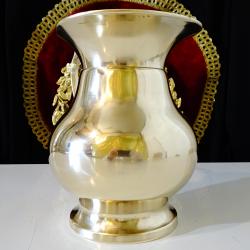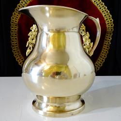 Стара кана за вино, ръчно отлята от масивен високо качествен бронз. Вечен съд с дебели стени и стабилна повдигната основа за да запазва виното студено. Каната не е ползвана блести като златно огледало от вън и от вътре, перфектна за употреба, декорация и подарък. Височина 16.5 см., диаметър 14 см., тегло 620 гр. Вместимост 1.2 л.