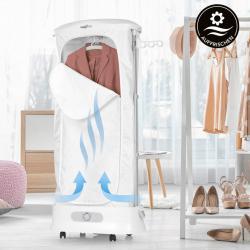 Функции: Сушене / Изглаждане / Освежаване с чиста пара; Капацитет: до 5 дрехи; включен комплект 5 напрежни закачалки/рамки; Мощност: 1350 W; Захранване: 220–240 V AC, 50/60 Hz; Материали: пластмаса, алуминий, найлон; Размер (сглобен): ≈ 66 × 35 × 150 см; Мобилност: колела; съхранение: сгъваем; Гаранция: 12 месеца.