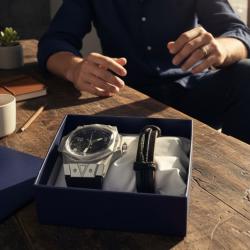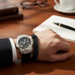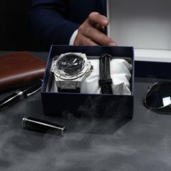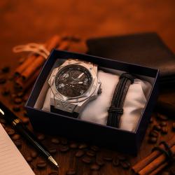 Тип: Мъжки комплект аксесоари за китка – аналогов часовник + декоративна гривна; Механизъм: Аналогов (час, минути, секунди); Циферблат: Skeleton стил; арабски индекси 2, 4, 8, 10; минутна скала; Корпус: Метален, сребрист; многоъгълен безел с декоративни винтове; Каишка (часовник): Черна, с катарама; Гривна: Черна, плетена стилистика, регулиране с възел; Комплектът включва: Часовник, гривна, подаръчна кутия.