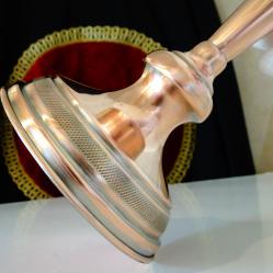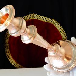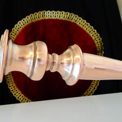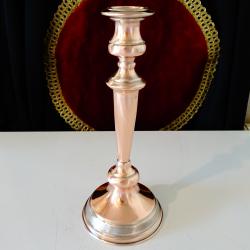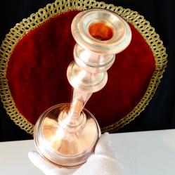 Старинен викториански меден свещник, майсторска ръчна изработка от масивна чиста червена мед. Изключително стилен, декориран с нежен релеф, ефектно подчертан с посребряване. Височина 25 см., диаметър на основата 10 см., тегло 320 гр.