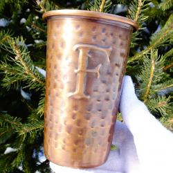 Стара медна чаша Ferdinands Gin ефектно декорирана с кован релеф и красива буква F. Чашата е маркирана с печат на производителя. Височина 12 см., диаметър 9 см., тегло 130 гр. Вместимост 400 мл.