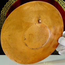 Стара медна чиния, плато, пано за стена, майсторска ръчна изработка от високо качествена чиста мед. Ръчно декорирана с релефно писани цветя и орнаменти. Има окачалка за стена. Диаметър 20 см., височина 1 см., тегло 150 гр.