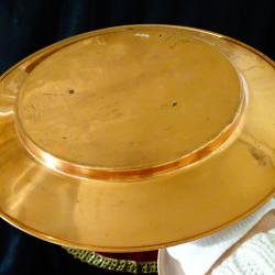 Стара медна чиния за стена, медно пано, релефна медна картина, майсторска ръчна изработка от масивна чиста червена мед. В центъра има релефно кован портрет в профил на мъж с каубойска шапка, карирана риза и вратовръзка, характерно облекло за Дивия Запад. Диаметър 23.5 см., височина 2 см., тегло 400 гр.