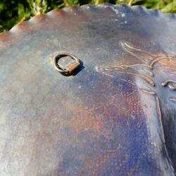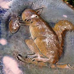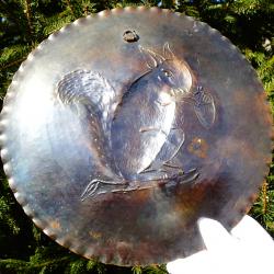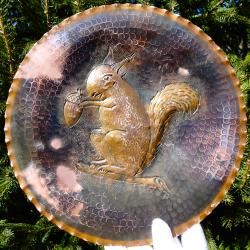 Стара медна чиния за стена, медно пано, релефна медна картина, ръчно кована с релефно изображение на Катерица, седнала върху клонка и държи жълъд. Паното има красив кован релеф и стабилна окачалка за стена. Диаметър 26.5 см., височина 2 см., тегло 330 гр.