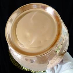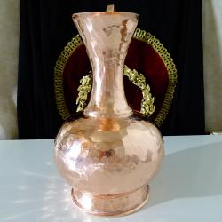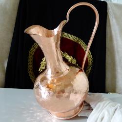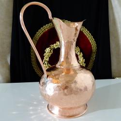 Стара медна кана за вино, ръчно кована от масивна чиста червена мед с ефектен релеф и искрящ огнен блясък, който озарява цялата стая. От вътре не е калайдисана. Височина 30 см., диаметър 20 см., тегло 800 гр. Вместимост 2.5 л.