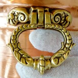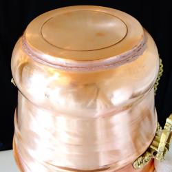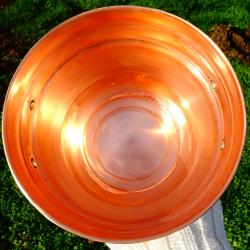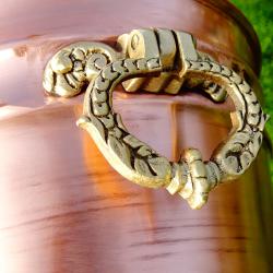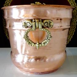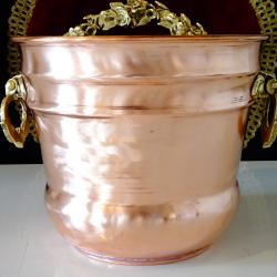Стара медна саксия, кашпа, меден съд, котле, майсторска ръчна изработка от блестяща чиста червена мед. Има две разкошни дръжки, отляти от масивен бронз, релефно декорирани с разкошни барокови орнаменти – много подходящи за дръжки на мебели. Саксията има забележка на дъното, която се вижда на снимките. Височина 15 см., диаметър 18 см., тегло 510 гр.