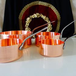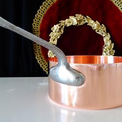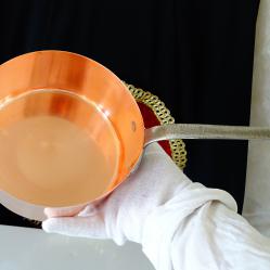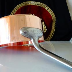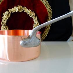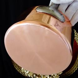 Стара медна тенджера, касерола, тиган, майсторска ръчна изработка от масивна чиста червена мед. Има яка чугунена дръжка закрепена със стабилни нитове. От вътре не е калайдисана, подходяща за медна вода. Тенжерата не е ползвана, блести ослепително от вън и от вътре. Елитен съд за готвене, сервиране и декорация. Височина 7.5 см., диаметър 16.5 см., дължина на дръжката 15 см., тегло 450 гр. Вместимост 1.5 литра. Тенджерата е част от комплект, който може да разгледате в моите обяви.