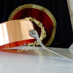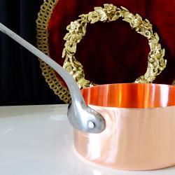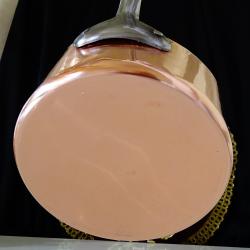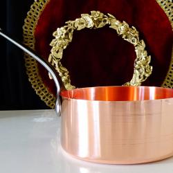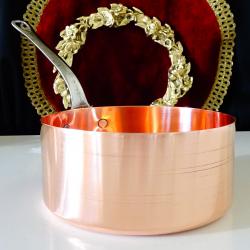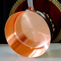 Стара медна тенджера, касерола, тиган, майсторска ръчна изработка от масивна чиста червена мед. Има яка чугунена дръжка закрепена с медни нитове. От вътре не е калайдисана, подходяща за медна вода. Тенжерата не е ползвана, блести ослепително от вън и от вътре. Елитен съд за готвене, сервиране и декорация. Височина 6.5 см., диаметър 14 см., дължина на дръжката 15 см., тегло 370 гр. Вместимост 1 литър. Тенджерата е част от комплект, който може да разгледате в моите обяви.